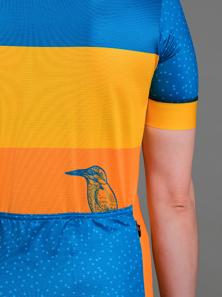 Der Eisvogel. Eleganter Jäger, territorialer Einzelgänger - und leider auch zunehmend durch Verbauung in seinen Brutplätzen eingeschränkt. Mit diesem Trikot wollen wir an diesen stolzen Meisterfischer erinnern - das Design ist eine abstrakte Interpretation seines schimmernden Federkleids.